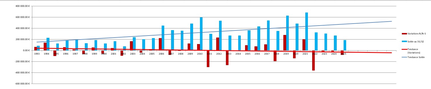 Néanmoins et afin de satisfaire les plus curieux et à la demande de contribuables locaux, vous trouverez ci-dessous un graphique retraçant l'évolution de la dette depuis la défusion avec la Commune d'Oberbronn soit depuis le 1er janvier 1993 ainsi qu'un autre concernant le solde du compte au Trésor au 31 décembre (Commune, eau et assainissement cumulés).